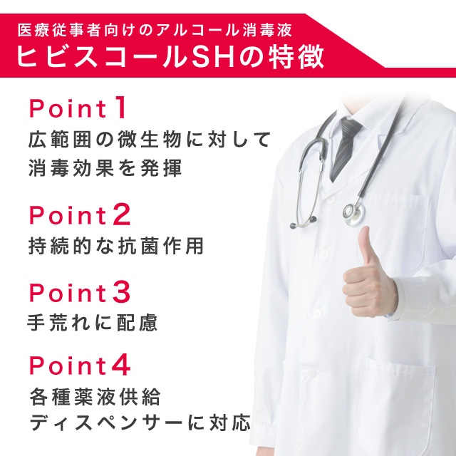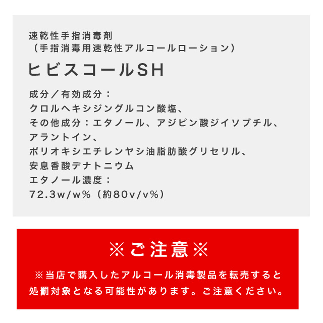 ヒビスコールSHは、100mL中に有効成分としてクロルヘキシジングルコン酸塩を0.1g、溶剤としてエタノール、その他添加物としてアジピン酸ジイソブチル、アラントイン、ポリオキシエチレンヤシ油脂肪酸グリセリル、安息香酸デナトニウムを含有する。